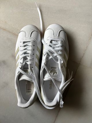 Zapatillas Adidas Gazelle sin estrenar, con un diseño clásico y elegante. - Color blanco con detalles dorados. - Talla 36 2/3