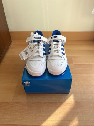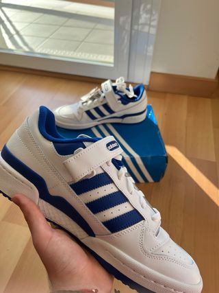 Vendo mis Adidas Forum Low, impecables. Son de color azul y blanco, y están nuevas. - Talla 43 1/3, donde apenas se nota la diferencia con una talla 43 (son 3 milimetros más de largo). - En tienda rondan los 120 euros. Ignorar zapatillas adidas forum low azules blancas azul blanco cómodas hombre mujer nuevas sin usar talla 43