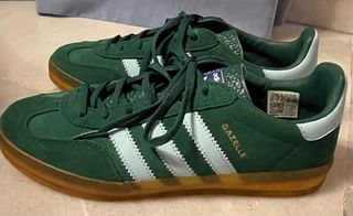 Zapatillas deportivas casi sin estrenar, como nuevas, imitando al modelo de Adidas Gazelle en color verde y las bandas laterales en celeste claro.
