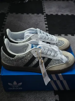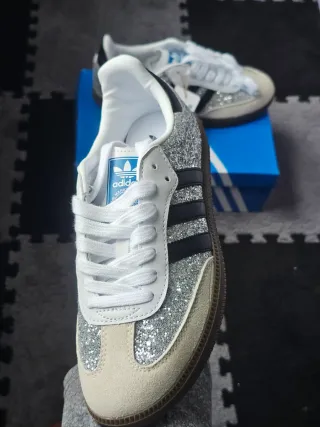 Zapatillas Adidas Samba OG con un diseño brillante. - Detalles en ante gris - Rayas laterales negras. - Acabado con purpurina plateada.