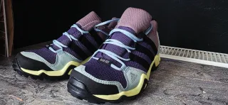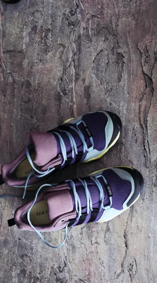 Están sin estrenar. Las vendo porque las compramos como regalo y no eran el número adecuado. Desgraciadamente, perdí el ticket, así que no pudimos cambiarlas. Zapatillas deportivas Adidas Terrex con tecnología Rain.Dry. Impermeables. Colores: morado y violeta con detalles en amarillo, azul claro y negro; cordones: azul claro; suelas: negro. Cierre ajustable con cordones. Suelas de buen agarre para distintos terrenos.