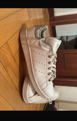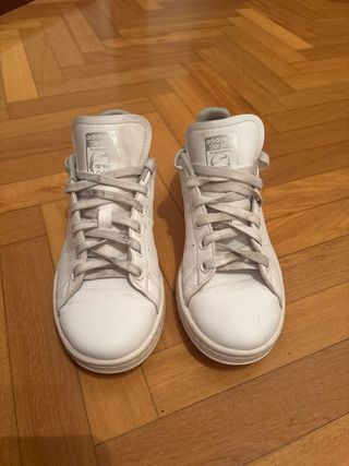 Zapatillas deportivas Adidas Stan Smith en color blanco. Un clásico atemporal para el día a día. - Diseño icónico. - Cierre con cordones. - unico problema son los cordones estan negros yo los cambiaria, y les falta las plantillas pero por lo demas estan impecables