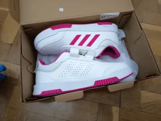 Zapatillas deportivas nuevas sin usar. - Diseño moderno en blanco con detalles en rosa. - Cierre de velcro para un ajuste fácil.