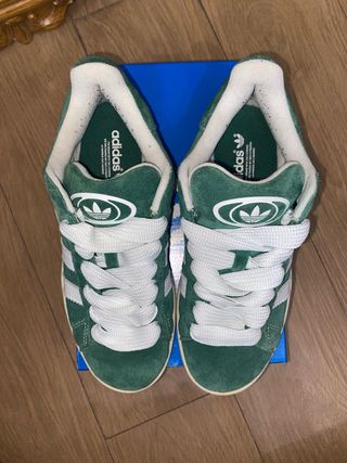 Zapatillas Adidas Campus de color verde. - Diseño clásico con las tres rayas blancas. - Material de ante. - Cordones blancos.