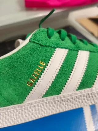 Zapatillas Adidas Gazelle en color verde con detalles blancos. Un clásico deportivo. - Diseño icónico de tres rayas. - Detalle Gazelle en dorado. Usadas una vez