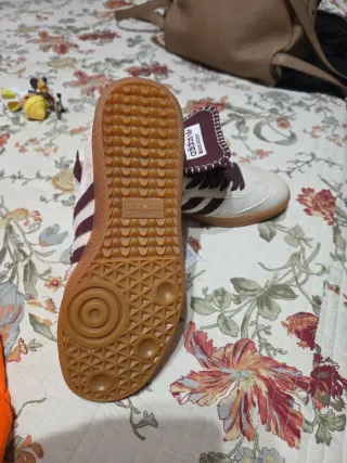 Zapatillas Adidas Samba con suela de goma. - Diseño clásico. - Parte superior de cuero blanco. - Suela de goma marrón. - Logo de Adidas en la lengüeta y el talón.