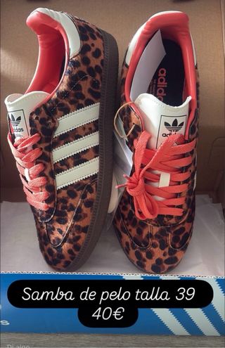 Zapatillas Adidas Samba con estampado de pelo. - Talla 39. - Diseño multicolor con detalles de leopardo. - Cordones en color coral. - Interior en color coral.
