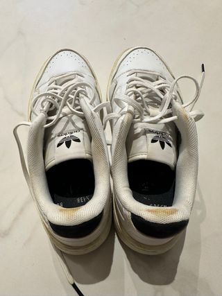 Zapatillas deportivas Adidas en color blanco con detalles en negro. - Diseño clásico. - Logo de Adidas en la lengüeta. - Cordones blancos. - la zapatillas están en buen estado ( sin rotos ni desperfectos) pero la suela y el forro tienen el color tomado de estar guardadas )