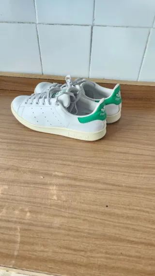 Modelo: Stan Smith Talla: 38 2/3 Corresponde a 23,5 cm de plantilla Originales, compradas en tienda Adidas oficial. Nunca usadas, con caja. Las vendo a bajo precio porque la puntera del zapato corresponde al pie derecho tiene una marca poco visible, y la caja esta pintada por la tapadera. Eran un regalo pero compré la talla equivocada.