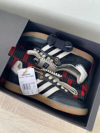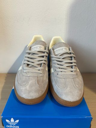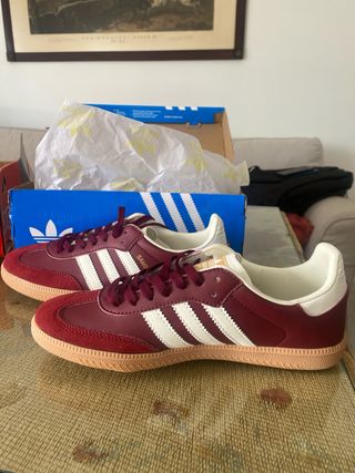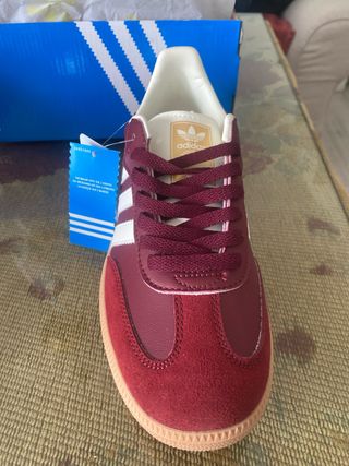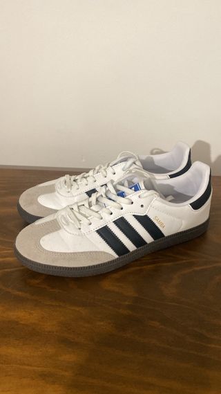 Zapatillas Adidas Samba OG en color beige con detalles en marrón. - Diseño clásico. - Tres rayas laterales. - Suela de goma. - Logo de Adidas en la lengüeta. Regalo de Reyes que me queda algo grande y no tengo ticket de compra. Mi pie mide 25,5cm y me sobra algo mas de un dedo