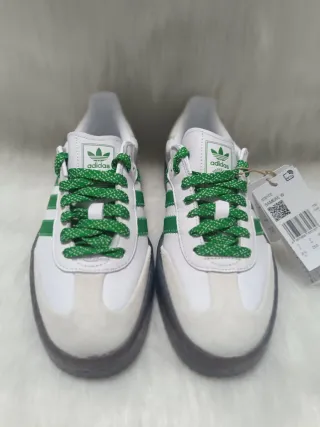 Zapatillas Adidas Sambae Cloud W en blanco con detalles verdes. - Cordones verdes. - Tres rayas verdes características de Adidas. - Suela de goma. - Logo de Adidas en la lengüeta. Originales, en su caja original, compradas en tienda.