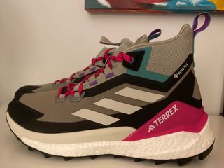 Botas de senderismo altas Adidas Terrex con tecnología Gore-Tex. ( impermeables ) Precio original 230€ - Color gris y detalles en rosa. - Cierre con cordones. - Suela de goma para mayor agarre.