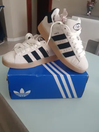 Zapatillas deportivas Adidas modelo Campus. - Exterior de ante negro. - Detalle de las tres franjas blancas. - Cordones blancos. - Suela de goma. - Logo de Adidas en la lengüeta y el talón.