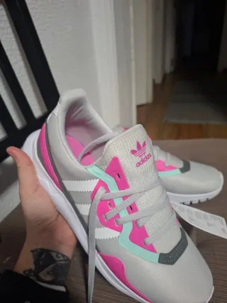 Zapatillas deportivas Adidas en tonos rosa y verde. Perfectas para el día a día o para hacer deporte. - Diseño moderno y ligero. - Cierre con cordones. - Logo de Adidas en la lengüeta y el lateral.