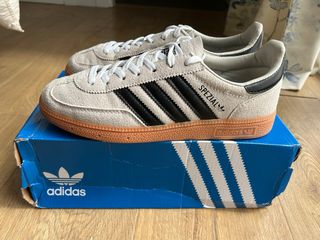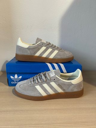 Zapatillas Adidas Spezial con un diseño clásico y atemporal. Es el 40 pero las recomiendo para una persona que use un 39. Tallan pequeñas. Compradas en Hacoo. - Parte superior de ante. - Detalle de las tres rayas en negro. - Suela de goma. - Cierre con cordones.