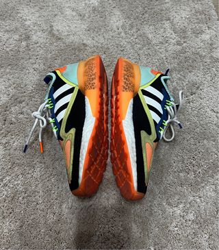Zapatillas deportivas Adidas ZX en talla 39. Combinan colores llamativos para un estilo único. - Diseño moderno con detalles en naranja y negro. - Suela con buen agarre. - Cordones blancos.