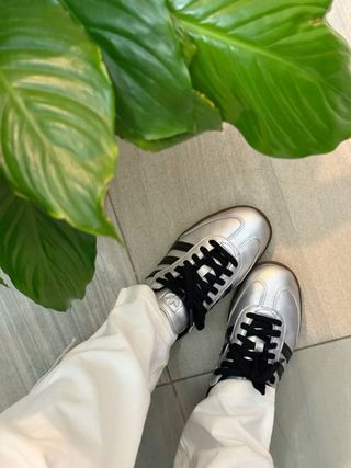 Zapatillas Samba con un llamativo acabado plateado y detalles blancos. Talla 39