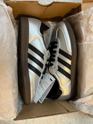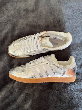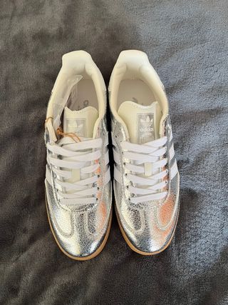 Zapatillas Adid4s Samba en color plata y blanco. Fueron un regalo y las vendo pq me estan pequeñas. - Diseño llamativo en plata metalizada. - Detalles en blanco. - Suela de goma. - Cierre con cordones.