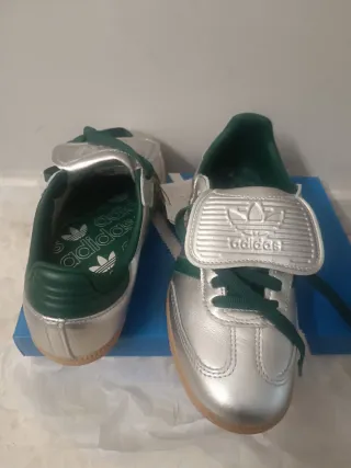 Zapatillas Adidas Samba LT en talla 38. Un diseño clásico con un toque moderno. - Combinación de colores plateado y verde. - Suela de goma. - Cierre con cordones y lengüeta característica.