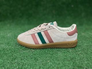 Zapatillas de la marca Adidas en talla 36. Combinan tonos beige con detalles en rosa y verde. - Diseño clásico de Adidas. - Material exterior de ante. - Suela de goma. - Detalle de las tres rayas en los laterales.