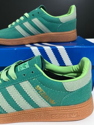 Zapatillas Adidas Spezial en color verde, talla 36. Combinan gamuza y detalles en contraste. - Diseño clásico de Adidas. - Suela de goma marrón. - Tres rayas laterales icónicas.