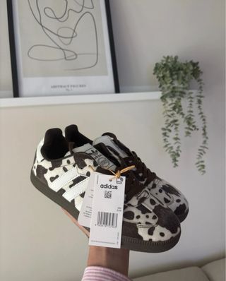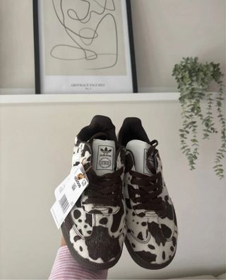 Zapatillas Adidas Samba con un diseño único de vaca. - Estampado de vaca en marrón y blanco. - Detalles de las tres rayas de Adidas en blanco. - Cordones marrones. - Suela de goma marrón.
