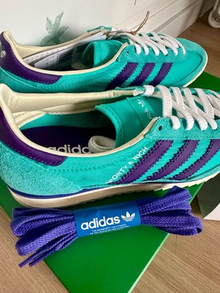 Zapatillas Adidas SL 72 en colaboración con Sporty & Rich. Un diseño llamativo con detalles en morado y verde azulado. - Cordones blancos. - Detalle de Sporty & Rich en el lateral. - Incluye cordones extra en color morado.