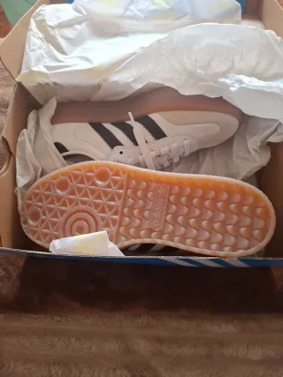 Zapatillas Adidas Samba sin estrenar. Un clásico reinventado con un diseño moderno. - Parte superior de cuero blanco. - Rayas laterales negras. - Suela de goma marrón.