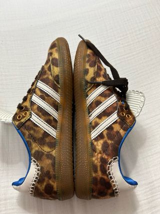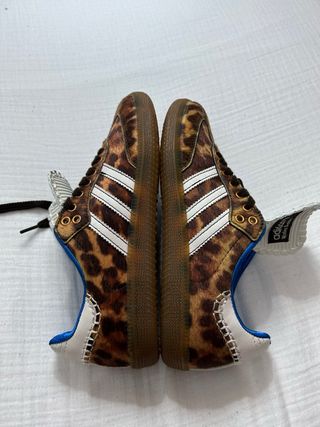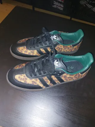 Zapatillas Adidas Samba con un llamativo estampado de leopardo. - Diseño de corte bajo. - Tres rayas blancas características de Adidas. - Suela de goma. - Detalle de costuras blancas en el talón.