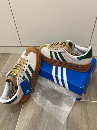 - Si te interesan, mandame mensaje. No comprar sin hablar previamente - Zapatillas Adidas Gazelle Bold en color beige rayas verdes. Nuevas a estrenar, incluyen la caja aunque como se puede ver en las fotos esta un poco dañada. Talla 38. Las vendo porque me equivoque con la talla y me quedan grandes (uso 37).