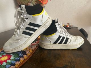 Zapatillas altas de la marca Adidas para niño en talla 37. Combinan blanco con detalles en negro y amarillo. - Cierre con cordones blancos. - Tres rayas laterales negras. - Cuello acolchado negro con borde amarillo.