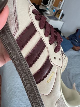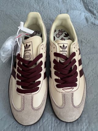 Zapatillas Adidas Samba en tonos beige y marrón. - Diseño clásico. - Detalles en ante y piel. - Cordones en color burdeos y blancos.