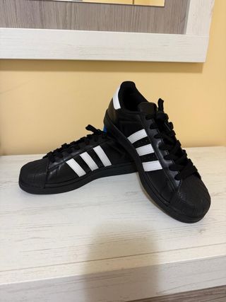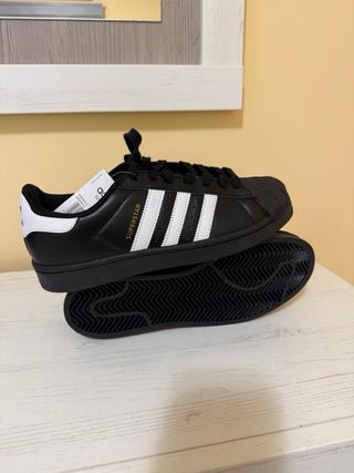 Zapatillas Adidas Superstar clásicas en color negro con detalles blancos. - Diseño icónico de tres rayas. - Puntera de goma. - Cierre de cordones.