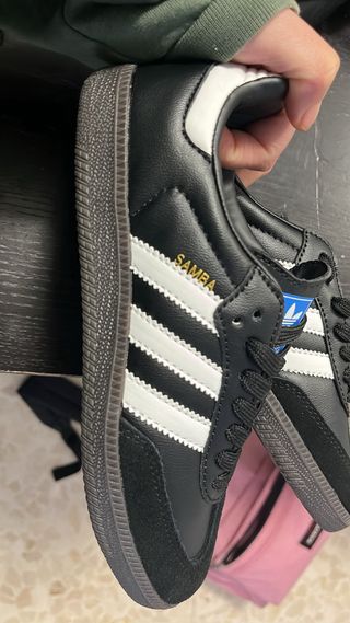 Zapatillas Adidas Samba con un diseño clásico y deportivo. - Combinación de colores negro y blanco. - Detalle de las tres rayas icónicas de Adidas. - Suela de goma.