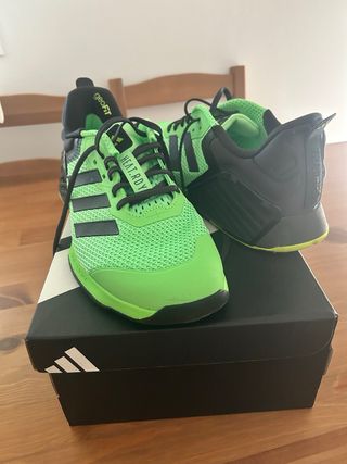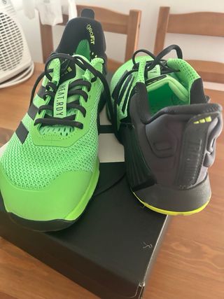 Zapatillas deportivas Adidas Dropset 3 par crossfit y gimnasio . en color verde neón y negro. Diseñadas para el rendimiento. Talla 43 1/3 - Cierre con cordones. - Detalle HEAT.RDY en la lengüeta. - Logo geoFIT en el cuello. - Tres rayas laterales de Adidas.