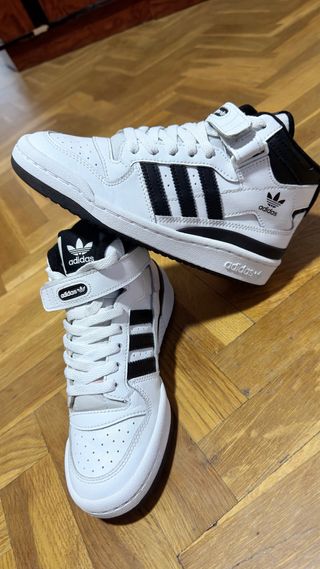 Zapatillas Adidas Forum Mid de corte alto en blanco y negro. Un diseño clásico y versátil. - Cierre de velcro en el tobillo. - Tres rayas características de Adidas en los laterales. - Logo de Adidas en la lengüeta y el talón.