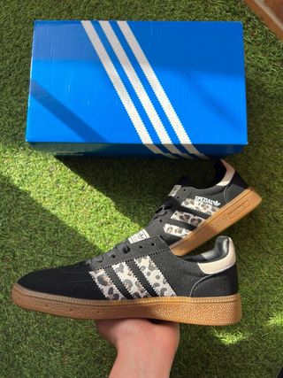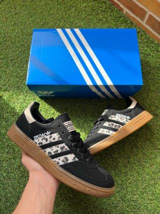 Zapatillas Adidas Handball Spezial con un diseño llamativo. - Parte superior de ante negro. - Detalle de las tres rayas con estampado de leopardo. - Suela de goma marrón. - Cierre de cordones.