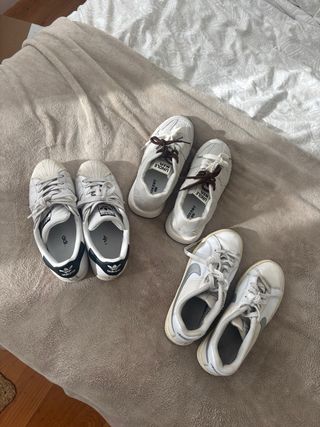 Lote de tres pares de zapatillas deportivas. - Dos pares de zapatillas Adidas. - Un par de zapatillas Nike. - Combinación de colores blanco y negro. Son talla 38 38 con cinco y 39, pero que talla como si fuera una 38