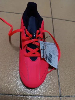 Zapatillas de fútbol Adidas para niño, con un diseño llamativo en rojo y negro. - Cierre con cordones. - Detalle de las tres rayas de Adidas. ADIDAS X SPEEDFLOW.3 FG Rojo/Dorado Metálico/Negro Se han puesto 10 veces, por lesion y cese de jugar toda temporada. Están muy bien. Tacos muy bien. Ver fotos para ver pequeños signos de desgaste por partidos. Talla 40 ( 25 cm)
