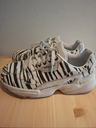 Zapatillas Adidas Originals para mujer, con estampado tipo cebra en blanco y negro y detalles en pelo. Diseño muy llamativo y original. Talla EU 39⅓ (24,5 cm). Cómodas y robustas, estilo chunky. En buen estado general, con desgaste normal de uso visible en la suela (ver fotos). Modelo poco común, ideales para looks urbanos.