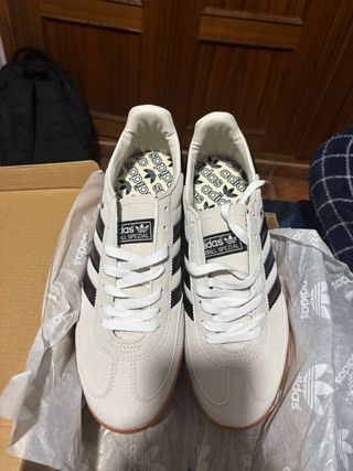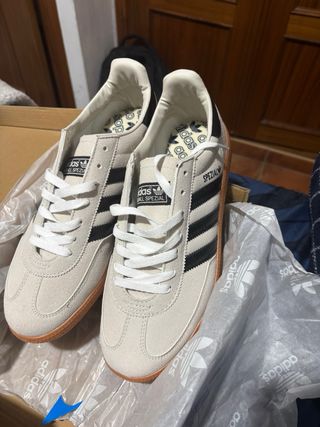 Zapatillas Adidas Spezial en talla 42. Un diseño clásico con un toque moderno. - Combinación de colores beige y negro. - Detalle de las tres rayas icónicas de Adidas.