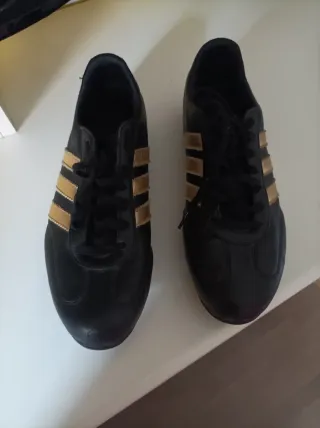 Zapatillas deportivas Adidas con un diseño clásico y elegante. - Combinación de colores negro y dorado. - Tres franjas icónicas de Adidas en los laterales. - puestas dos veces. - En mí perfil tengo otras cosas.