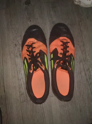 Zapatillas de fútbol sala Adidas en color negro y naranja. - Diseño deportivo. - Cierre con cordones.