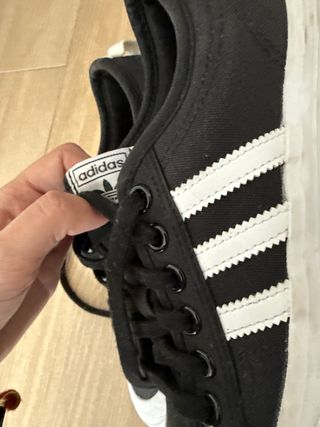 Zapatillas negras y blancas ambas de Adidas, cada par 18€, dos pares 30€. Las blancas con colores a la derecha, no tienen marca, 8€. - Diseño en color negro y blanco. - Cierre con cordones.