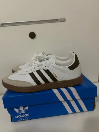 Zapatillas Adidas Samba OG en color blanco y negro, talla 39. Un clásico atemporal con un diseño icónico. - Parte superior de cuero y ante. - Suela de goma. - Detalle de las tres rayas en contraste.