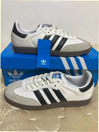 Zapatillas Adidas Samba en talla 43. Combinan blanco y gris con las icónicas tres franjas negras. - Diseño clásico. - Materiales de calidad.