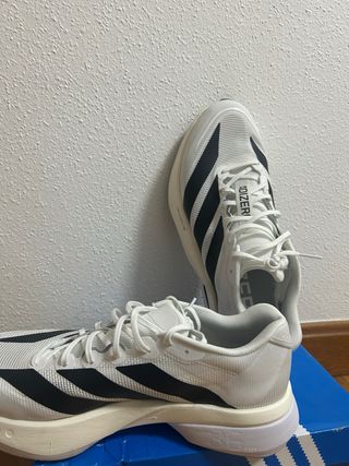 Zapatillas deportivas Adidas Adizero Boston 13 en color blanco con detalles en negro. Nuevas, sin estrenar. - Diseño moderno y ligero. - Tecnología Lightstrike Pro.