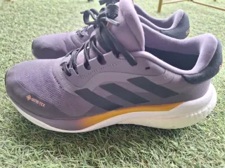 Zapatillas deportivas Adidas en color morado con detalles en naranja y negro. Perfectas para running o senderismo. - Tecnología Gore-Tex. - Suela con amortiguación. - Diseño moderno y funcional.