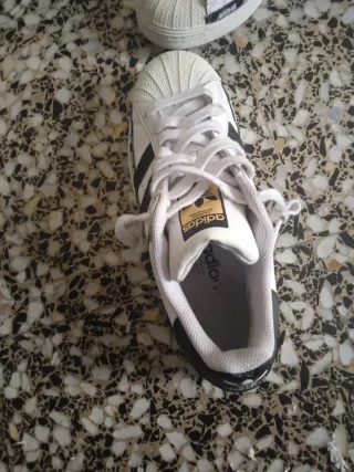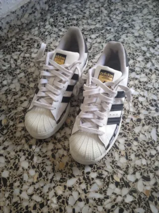 Zapatillas deportivas Adidas Superstar con un diseño clásico. - Parte superior de cuero blanco. - Rayas laterales negras. - Cierre con cordones blancos. - Suela de goma. - Detalle del logo en la lengüeta.