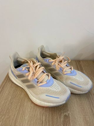 Zapatillas Adidas Pureboost en color beige y naranja. Están ligeramente usadas, pero en buen estado. - Modelo Pureboost de Adidas. Amortiguacion y confort. - Ideales para el día a día. - Con un lavado pueden quedar clmo nuevas.